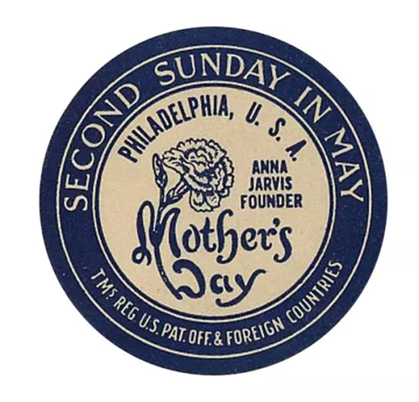 Jarvis protegió con derechos de autor su propia fotografía y registró las marcas del Sello del Día de la Madre con un dibujo de un clavel y las palabras “Día de la Madre” (siempre en singular para distinguirla de “Día de las madres”), “Segundo domingo de mayo” y “Anna Jarvis Fundadora”. (Sociedad Histórica Lancaster)
