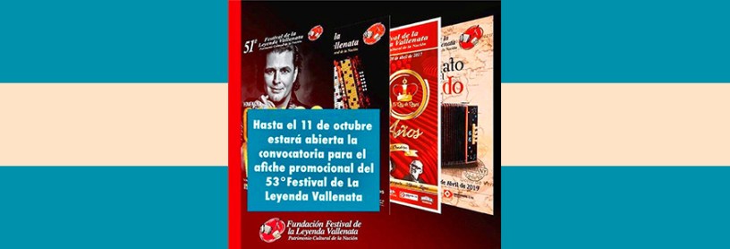 La Fundación Festival de la Leyenda Vallenata anuncia que hasta el 11 de octubre de 2019, estará abierta la convocatoria para la creación del afiche promocional del 53º del Festival de la Leyenda Vallenata, que se realizará del 29 de abril al 2 de mayo de 2020 y se le rendirá homenaje a Jorge Oñate, ‘La Leyenda’ y reconocimiento a Rosendo Romero, ‘El Poeta de Villanueva’.