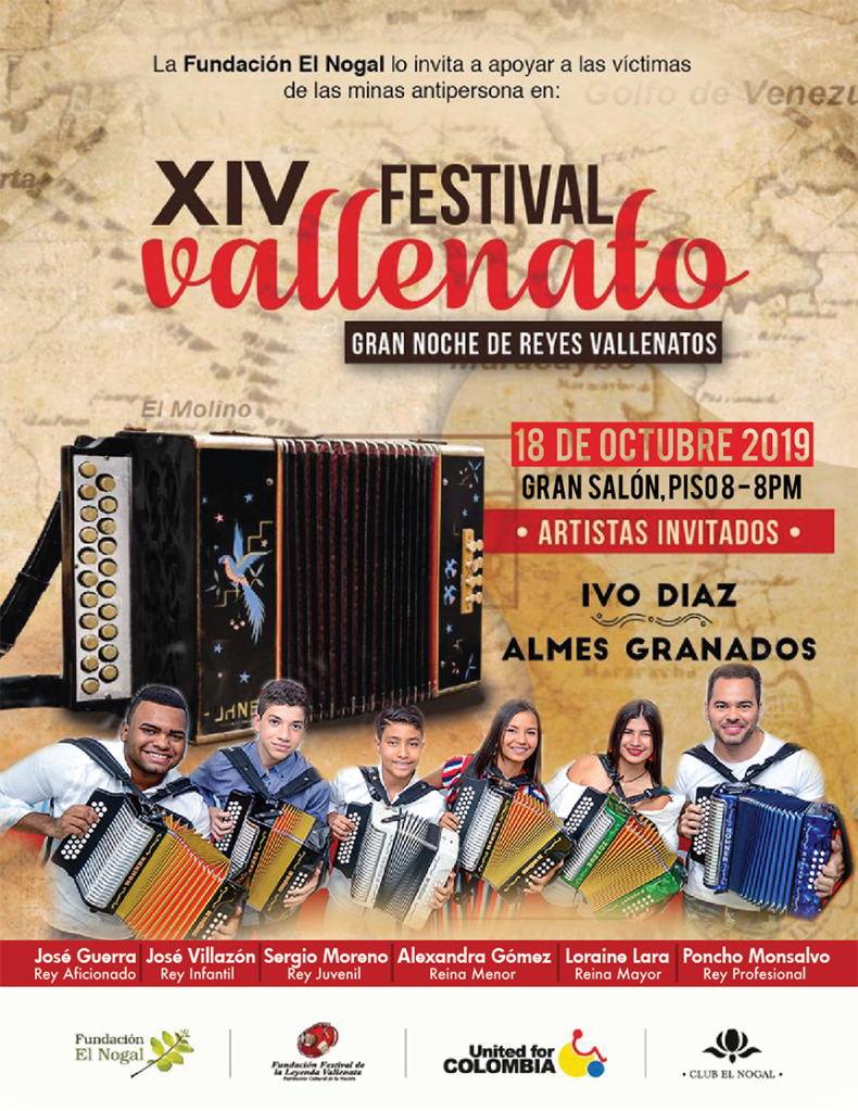 Este viernes 18 de octubre a partir de las 8:00 de la noche en el Club El Nogal de Bogotá, estarán presentes los Reyes y Reinas del 52° Festival de la Leyenda Vallenata, con la finalidad de entregar a través de las notas de sus acordeones el vallenato clásico y unirse a una labor social a favor de víctimas de la violencia.