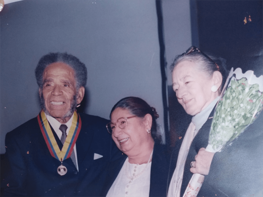 En la fotografía, Manuel Zapata Olivella luciendo la condecoración de Palabrero Mayor que le otorgó la Fundación Cultural Palabrería dirigida por Gustavo Adolfo Ramírez. Al lado la antropóloga Ruth Ariza quien llevó la palabra en el evento.