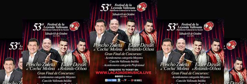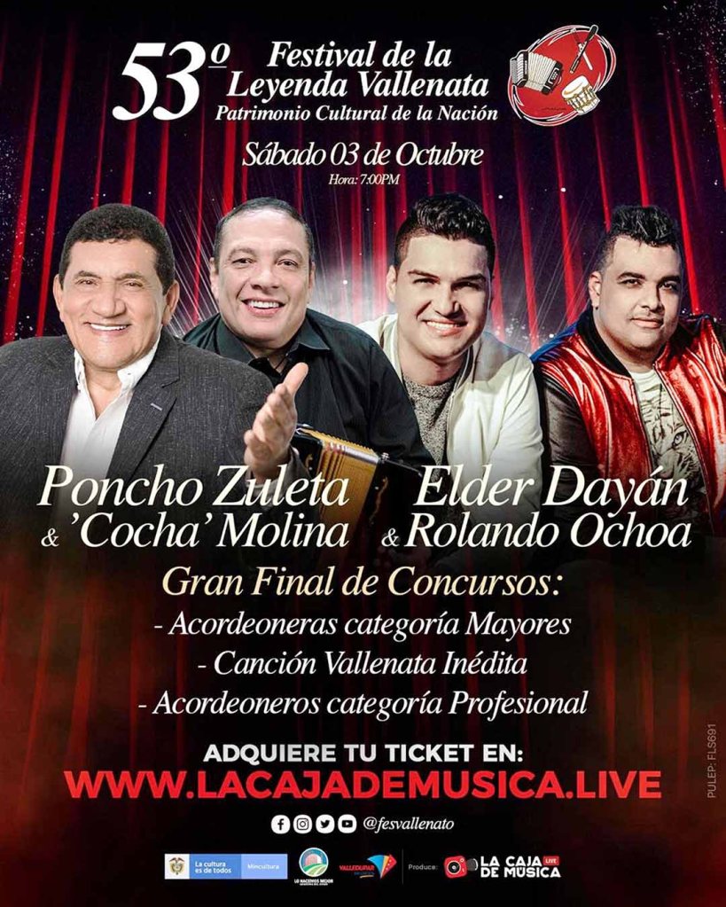 La Fundación Festival de la Leyenda Vallenata anuncia para el cierre del 53° Festival de la Leyenda Vallenata, el próximo tres de octubre después de la gran final de los concursos de Acordeonera Mayor, Canción Vallenata Inédita y Acordeón Profesional, la presentación de un gran concierto con los artistas Poncho Zuleta – el Rey de Reyes Gonzalo ‘El Cocha’ Molina y Elder Dayan – Rolando Ochoa.