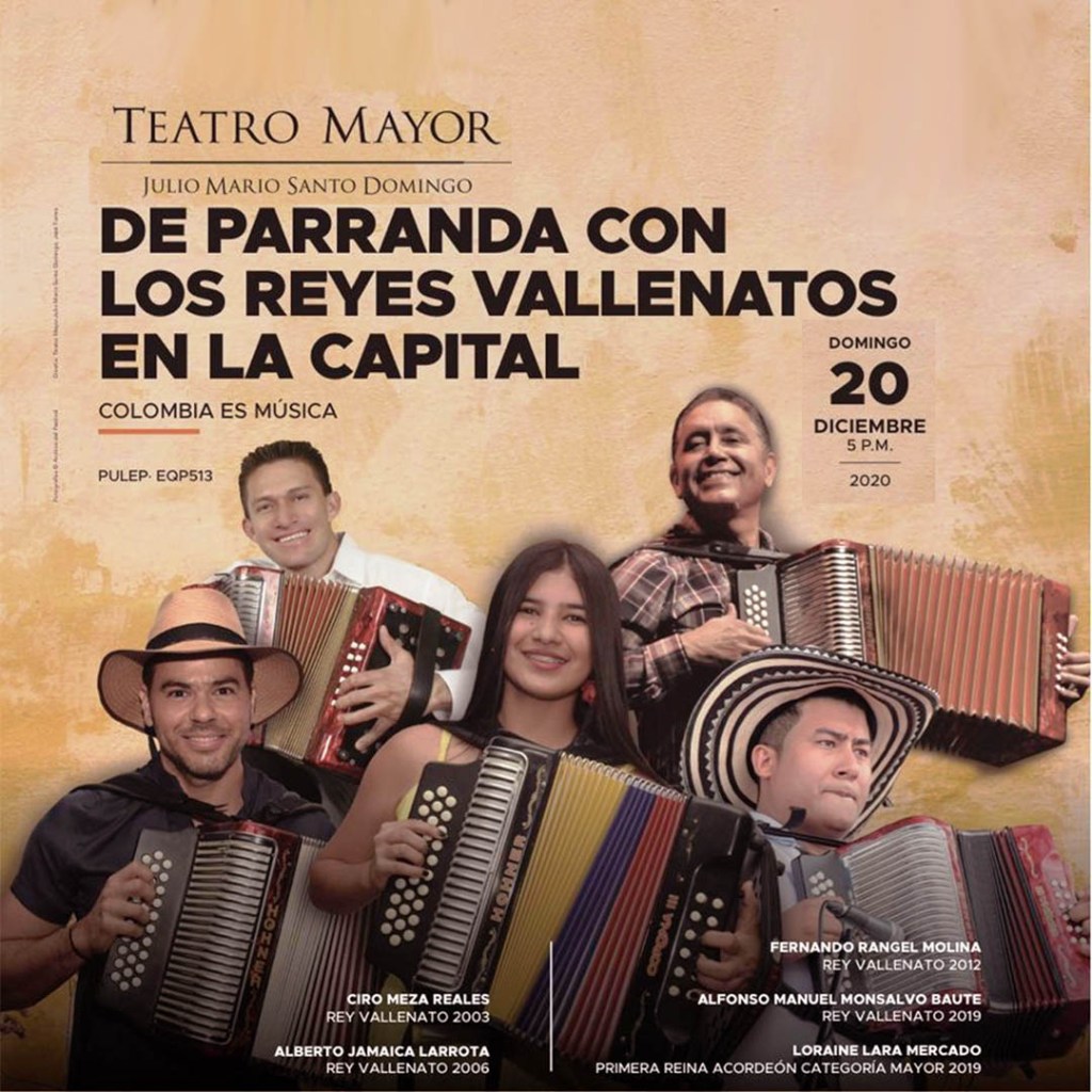 Para el domingo 20 de diciembre a partir de las 5:00 de la tarde en el Teatro Mayor Julio Mario Santo Domingo de la capital del país se tiene prevista una gran parranda vallenata.