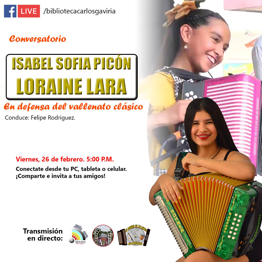 La Biblioteca Popular Carlos Gaviria Diaz de Riohacha y el Movimiento en Defensa del Vallenato Clásico se complacen en presentar el ciclo de conversatorio las mujeres con su talento y virtuosidad se toman en vallenato; comenzamos con las talentosas ejecutantes del acordeón las jóvenes Isabel Sofia Picon y Loraine Lara, este viernes 26 de febrero, a partir de las 5 de la tarde. Todos cordialmente invitados.