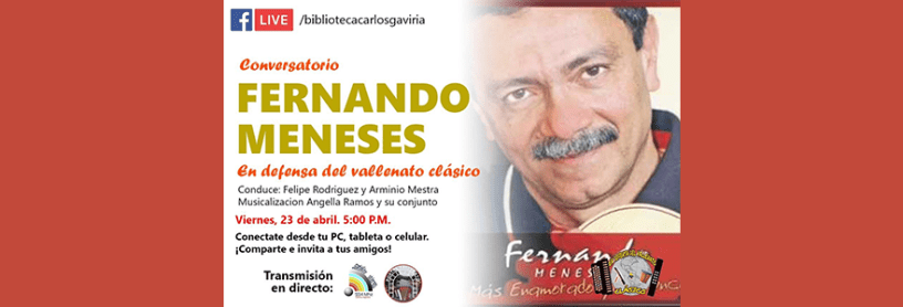 La Biblioteca Popular Carlos Gaviria Diaz y el Movimiento en Defensa del Vallenato Clásico se permiten invitarlos al conversatorio con Fernando Meneses Romero para este viernes 23 de abril, a partir de las 5 de la tarde. Todos cordialmente invitados.