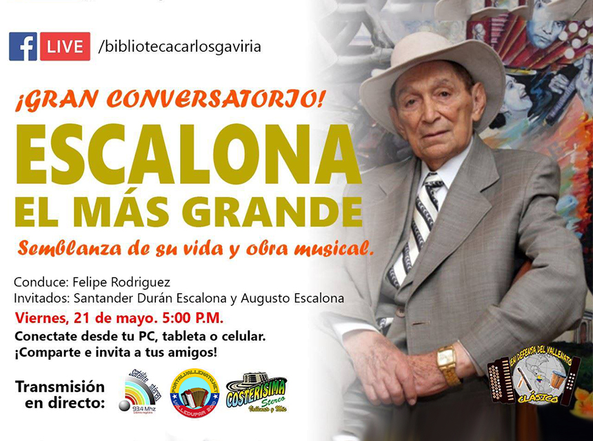 La Biblioteca Popular Carlos Gaviria Diaz de Riohacha y el Movimiento en Defensa del Vallenato Clásico les invita al conversatorio Al Mas Grande: Escalona. Con nuestros invitados Santander Duran Escalona, Augusto Escalona donde haremos una remembranza a la vida y obra del maestro Escalona, este viernes 21 de mayo a partir de las 5 de la tarde.