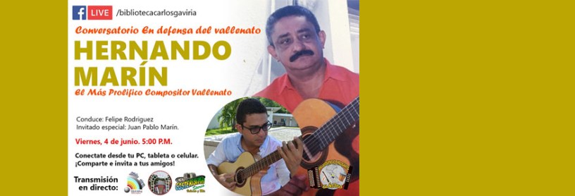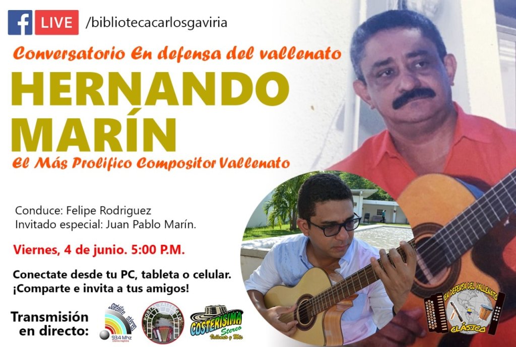 La Biblioteca Popular Carlos Gaviria Diaz de Riohacha y el Movimiento en Defensa del Vallenato Clásico presentan a Juan Pablo Marin en el conversatorio Hernando Marín: El Mas Prolífico de los Compositores Vallenatos. Con los invitados especiales Juan Pablo Marín hijo de Nando Marín y los maestros Sergio Moya Molina unico sobreviviente del Trio de Oro y Santander Durán ganador en 4 oportunidades del concurso de la canción inédita del Festival de la Leyenda Vallenata. Viernes 4 de junio, a partir de las 5 de la tarde.
