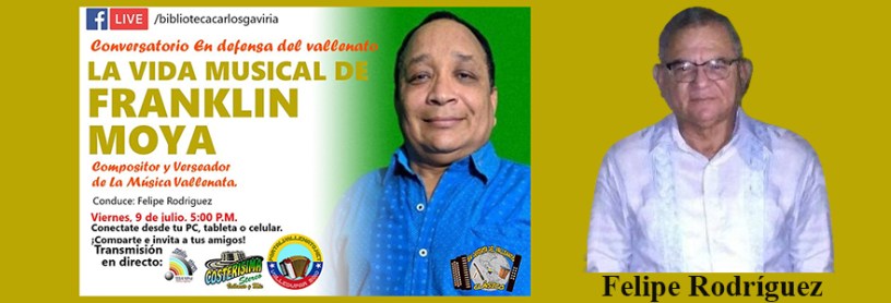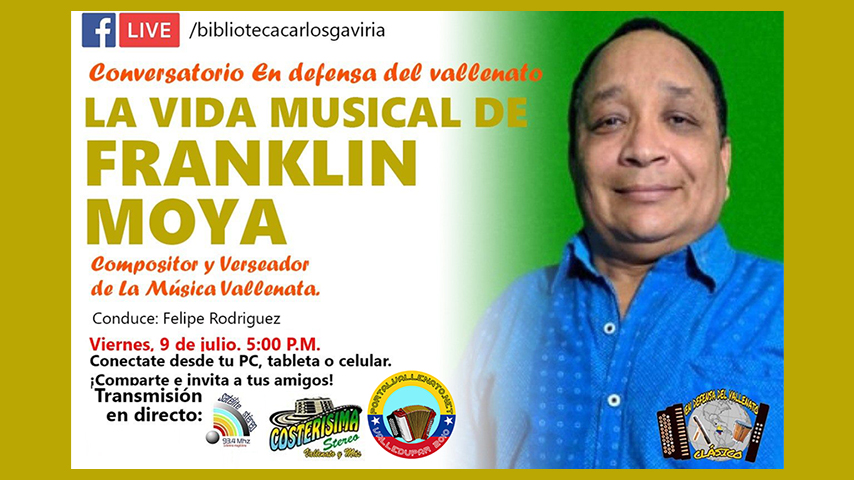 La biblioteca popular carlos Gaviria Diaz de Ríohacha y el Movimiento en Defensa del Vallenato Clásico presentan el conversatorio sobre la vida musical de Franklin Moya compositor y verseador de la música vallenata, que se transmitirá por facebook live en la página de la biblioteca popular Carlos Gaviria este viernes 9 de julio, a partir de las 5 de la tarde.