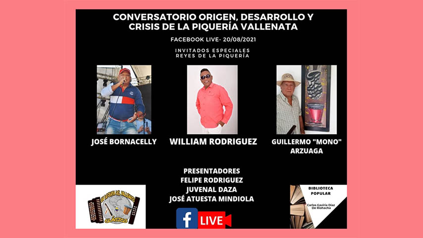 La Biblioteca Popular Carlos Gaviria Diaz de Riohacha y el Movimiento en Defensa del Vallenato Clásico que organizan los Conversatorios en Defensa del Vallenato Clásico presentarán este viernes 20 de agosto el conversatorio Origen, Desarrollo y Crisis de la Piquería Vallenata, con nuestros invitados especiales, los reyes de la piquería Willman Rodriguez, José Bornacelly y Guillermo “Mono” Arzuaga. En la presentación estarán Felipe Rodriguez, Juvenal Daza y el profesor José Atuesta Mindiola. Pueden verlo a partir de las 5 de la tarde, por Facebook live y por la página de la Biblioteca Carlos Gaviria.