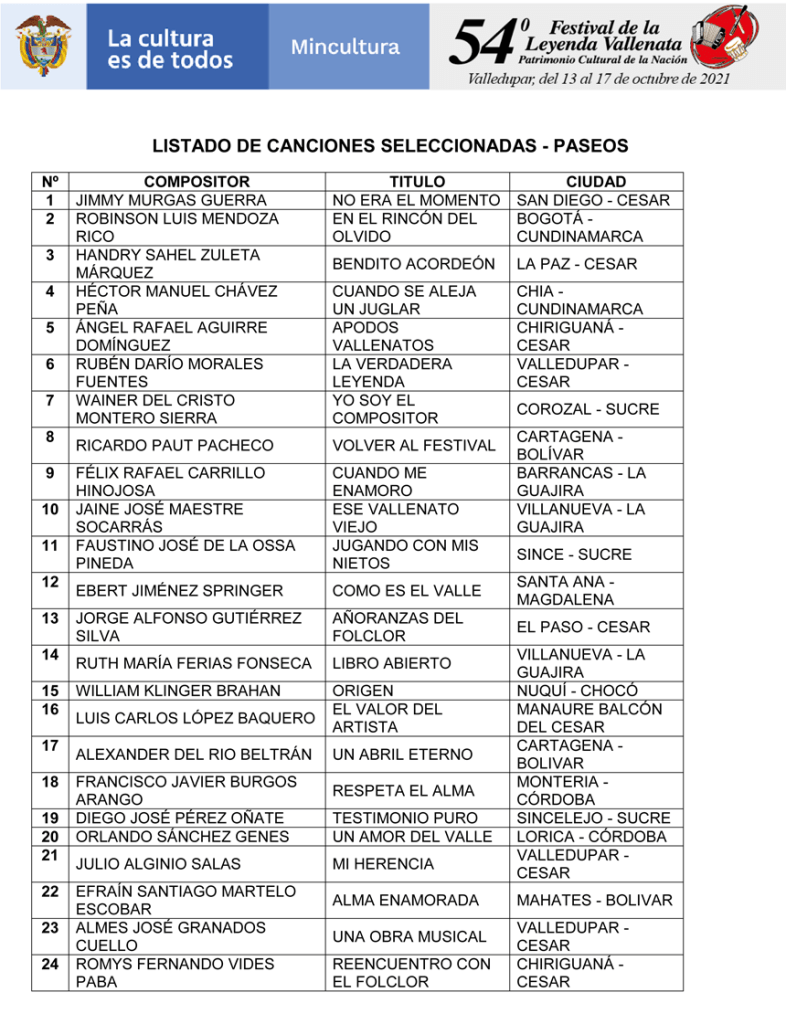 Con la selección de las canciones queda lista la nómina de concursantes que estarán presentes en el 54° Festival de la Leyenda Vallenata que se realizará del 13 al 17 de octubre.