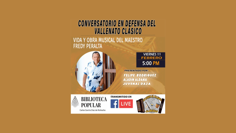 La Biblioteca Popular Carlos Gaviria Diaz de Riohacha y el Movimiento en Defensa del Vallenato Clásico presentan este viernes 11 de febrero a partir de las 5 de la tarde, el conversatorio Vida y Obra Musical del Maestro Fredy Peralta, Presentadores Felipe Rodríguez, Juvenal Daza Bermúdez y Aladin Aldana.