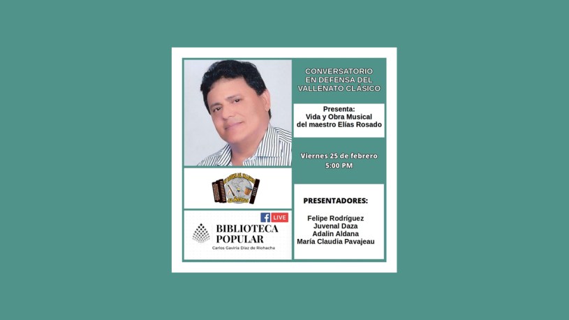 Conversatorio Homenaje a la Vida y Obra Musical del maestro Elias Rosado Vence organizado por la Biblioteca Popular Carlos Gaviria Diaz de Riohacha y el Movimiento en Defensa del Vallenato Clásico, este viernes 25 de febrero a partir de las 5 de la tarde, estarán en la presentación: Felipe Rodríguez, María Claudia Pavajeau, Juvenal Daza Bermúdez y Adalin Aldana.