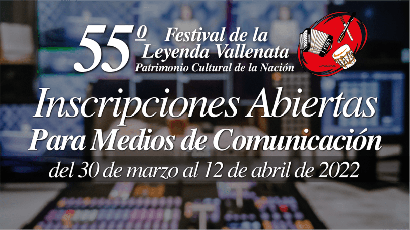 La Fundación Festival de la Leyenda Vallenata les informa a los medios de comunicación sobre el proceso de inscripción para el cubrimiento del 55º Festival de la Leyenda Vallenata, V Rey de Reyes en homenaje a Jorge Oñate, ‘La Leyenda’ que se llevará a cabo del 26 al 30 de abril de 2022.