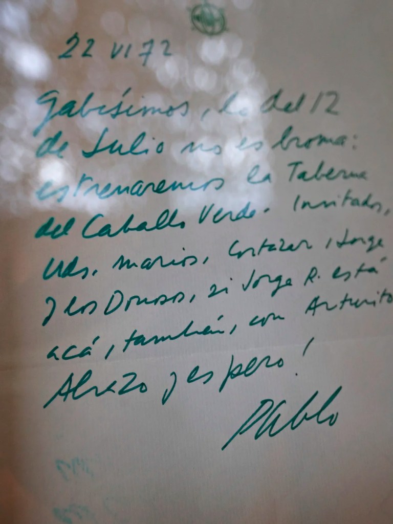 ”A mí la que más me gusta es la de Pablo Neruda porque me encanta la poesía, es una carta de 1972, eso quiere decir que mis padres eran jóvenes y Neruda no tanto, debió emocionarlos mucho”, comenta Gonzalo sobre la carta del poeta chileno en la que invita a Mercedes y a Gabo a un evento al que aparentemente también estaban convidados Mario Vargas Llosa y Julio Cortázar.