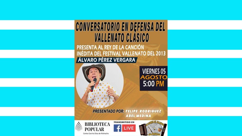 El conversatorio En Defensa del Vallenato Clásico tiene el gusto de presentar al Rey Vallenato de la canción inédita del Festival de la Leyenda Vallenata de 2013 Álvaro Pérez Vergara, este viernes 5 de agosto a partir de las 5 de la tarde. Los presentadores son Felipe Rodriguez, director de la biblioteca y Abel Medina Sierra investigador cultural, cuentista, ensayista.