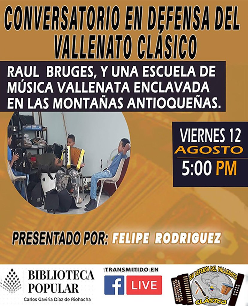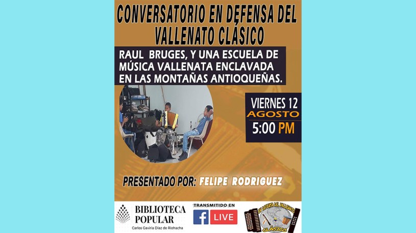 La biblioteca Popular Carlos Gaviria Diaz de Riohacha y el Movimiento en Defensa del Vallenato Clásico les están invitando hoy viernes 12 de agosto a partir de las 5 de la tarde al conversatorio Raúl Bruges: Y una Escuela de Música de Acordeón Enclavada en las Montañas Antioqueñas.