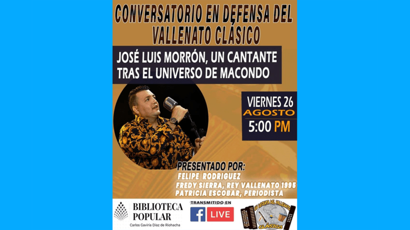 La Biblioteca Popular Carlos Gaviria Diaz de Riohacha y el Movimiento en Defensa del Vallenato Clásico presentan el conversatorio José Luis Morrón un Cantante Tras el Universo de Macondo, este viernes 26 de agosto, a partir de las 5 de la tarde.