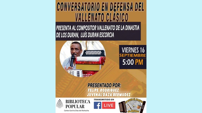 La Biblioteca Popular Carlos Gaviria Diaz de Riohacha y el Movimiento en Defensa del Vallenato Clásico presentan este viernes 16 de septiembre el conversatorio con compositor y cantante de la Dinastía de los Duran Luis Duran Escorcia a partir de las 5 de la tarde. En la presentación estarán con Felipe Rodriguez y Juvenal Daza Bermúdez.