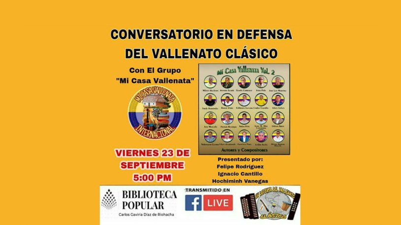 La Biblioteca Popular Carlos Gaviria Diaz de Riohacha y el Movimiento en Defensa del Vallenato Clásico tiene el gusto de invitarles al conversatorio con el grupo Mi Casa Vallenata, el cual, tiene por misión el rescate y preservación del vallenato autentico y tradicional, este viernes 23 de septiembre, a partir de las 5 de la tarde, los pueden observar por el Facebook live de la pagina de la biblioteca Carlos Gaviria. Es importante que los amantes del buen vallenato apoyemos este tipo de proyectos y grupos que tienen por labor la defensa del vallenato clásico y tradicional.