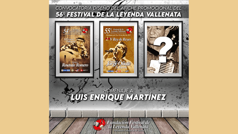 La Fundación Festival de la Leyenda Vallenata anuncia que hasta el miércoles 30 de noviembre de 2022 a las 5:00 de la tarde, estará abierta la convocatoria para la creación del afiche promocional del 56º del Festival de la Leyenda Vallenata, que se realizará del 26 al 30 de abril de 2023, y será en homenaje al Rey Vallenato Luis Enrique Martínez, al cumplirse el centenario de su natalicio.