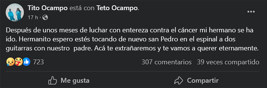 Quien también se pronunció al respecto fue precisamente su hermano, quien confirmó la muerte de Ernesto. “Después de unos meses de luchar con entereza contra el cáncer mi hermano se ha ido”.