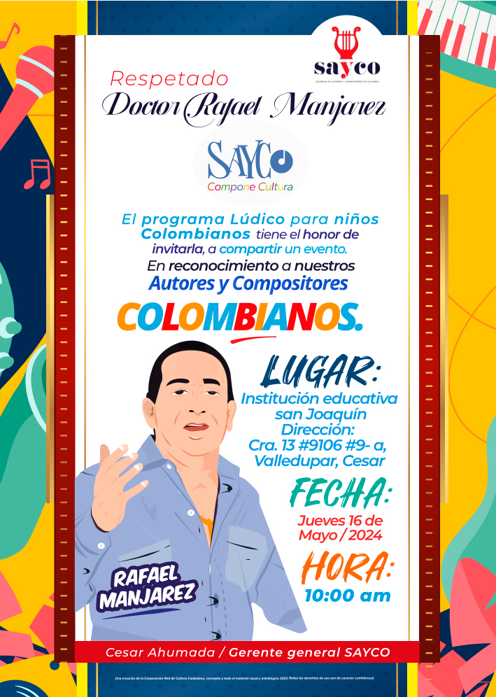 El evento tendrá lugar en el Colegio San Joaquín este próximo jueves 16 de mayo a partir de las 7:30 am y tiene como invitados especiales al exitoso maestro, compositor y presidente de SAYCO, Rafael Manjarrez y a la Juglaresa y reconocida compositora Rita Fernández Padilla, quienes presidirán la prestigiosa lista de convocados entre los que se encuentran Hernando Molina, Carlos Bloom, Omar Geles, Gustavo Gutiérrez, Emiliano Zuleta, Santander Durán, Julio Oñate, Tomás Darío Gutiérrez, Rosendo Romero, Rodolfo Molina, Ivo Díaz, entre otros invitados especiales.