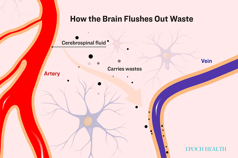 Alrededor de las arterias del cerebro hay una estructura en forma de vaina, con líquido cefalorraquídeo que fluye a través del espacio entre la arteria y esta vaina. Durante el sueño, los vasos sanguíneos del cerebro se contraen, aumentando el espacio entre los vasos y la vaina, lo que permite que fluya más líquido cefalorraquídeo. A medida que las arterias pulsan, el líquido cefalorraquídeo se bombea a través del tejido cerebral, eliminando los desechos, como las proteínas beta-amiloide y tau, de los espacios más profundos entre las células cerebrales, y finalmente eliminándolos del cerebro.