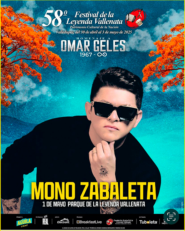 La Fundación Festival de la Leyenda Vallenata se complace en anunciar la participación de El Mono Zabaleta, destacado exponente del folclor vallenato, en la versión número 58 del Festival de la Leyenda Vallenata. El artista se presentará el próximo 1 de mayo en el emblemático Parque de la Leyenda Vallenata ‘Consuelo Araujonoguera de Valledupar.