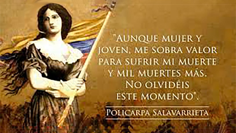 Polonia Salavarrieta y Ríos (hacia 1795 – 1817). Es nuestra heroína por excelencia, con un altar encendido en nuestra memoria. Nacida en Santafé de Bogotá. Huérfana cuando aún era niña, se esforzó en estudiar y aprendió a leer y escribir, lo cual le proporcionó versatilidad en el uso del lenguaje. Para sostenerse, instala en su casa una escuelita para enseñar las primeras letras… y algo de patriotismo. Algo husmean los espías realistas, llegan a la casa y la interrogan. “Solo soy costurera y maestra”, les dice, con voz segura y serena. También hace trabajos de costura en casas de familias realistas, solo para escuchar noticias y transmitirlas a sus amigos conspiradores. Y aún va más lejos: “…su mejor informante es el barbero particular de Sámano, Hilarión Cifuentes, que permanece en Palacio, … oye muchas noticias”, que hace llegar a su patriótico destino, escondidas dentro de naranjas.