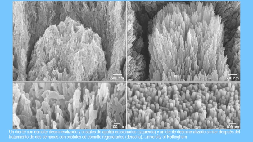Asimismo, el nuevo gel proporciona un andamiaje que atrae iones de calcio y fosfato de la saliva, promoviendo el crecimiento controlado de un nuevo mineral a través de un proceso llamado mineralización epitaxial, en el que un mineral crece sobre otro con una estructura compatible.